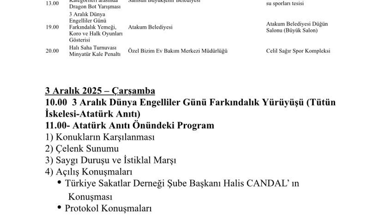 Samsun'da 3 Aralık Dünya Engelliler Günü kutlamaları, Onur Anıtı'nda çelenk sunumu ile başladı. Çok sayıda STK başkanları ve üyeleri, özel ve devlet bakım yurtlarından gelen engelliler etkinliğe katıldı. Aile ve Sosyal Hizmetler İl Müdürlüğü, Türkiye Sakatlar Derneği Samsun Şubesi, Samsun Bedensel Engelliler Spor Kulübü ve Körleri Eğitim ve Kalkındırma Derneği tarafından çelenk sunumu gerçekleştirildi.