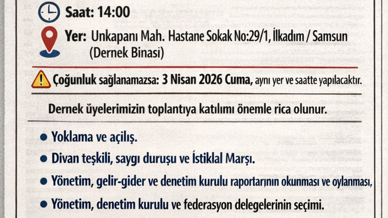 ⚠️ Çoğunluk sağlanamazsa: 3 Nisan 2026 Cuma, aynı yer ve saatte yapılacaktır.