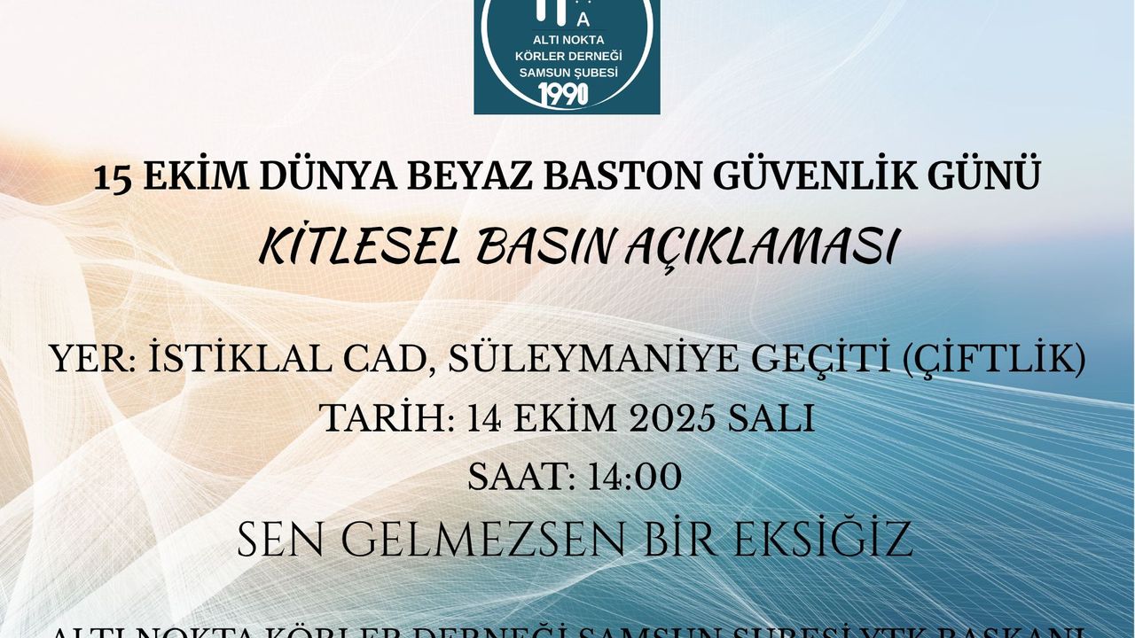 15 Ekim Dünya Beyaz Baston Güvenlik Günü kapsamında, Altı Nokta Körler Derneği Samsun Şubesi tarafından farkındalık oluşturmak amacıyla kitlesel basın açıklaması yapılacak.